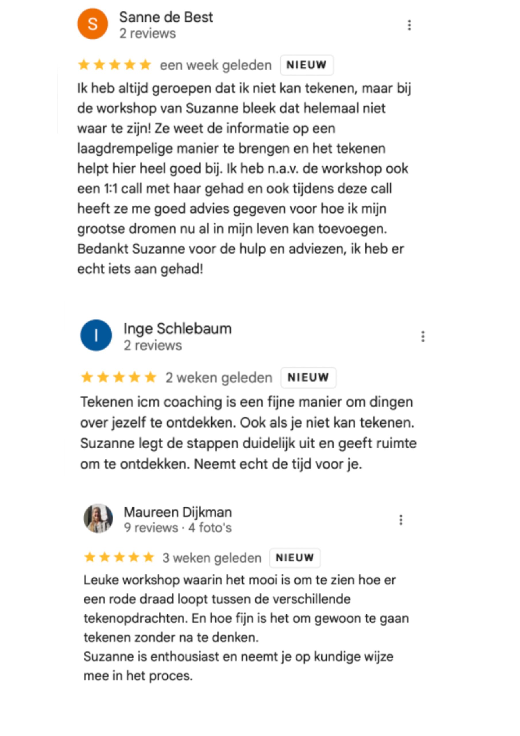 ”Door deze workshop bruis ik van de energie en inspiratie. Met een prachtige combinatie van creativiteit en coaching helpt Suzanne je om van hoofd naar hart te komen zodat je niet in DENKEN blijft hangen maar DAADWERKELIJK stappen gaat zetten. Een aanrader!” Martine